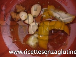 Versate tutto insieme, l’olio, il dado, la conserva o il pomodoro, la scorza di limone, gli spicchi d’aglio interi, il peperoncino.