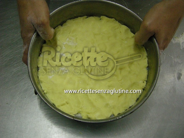 Due terzi vi serviranno per la base ed un terzo per formare le cordelle che metterete sopra alla fine. Ora prendete una tortiera e dopo averla rivestita con la carta da forno stendete la vostra base. |