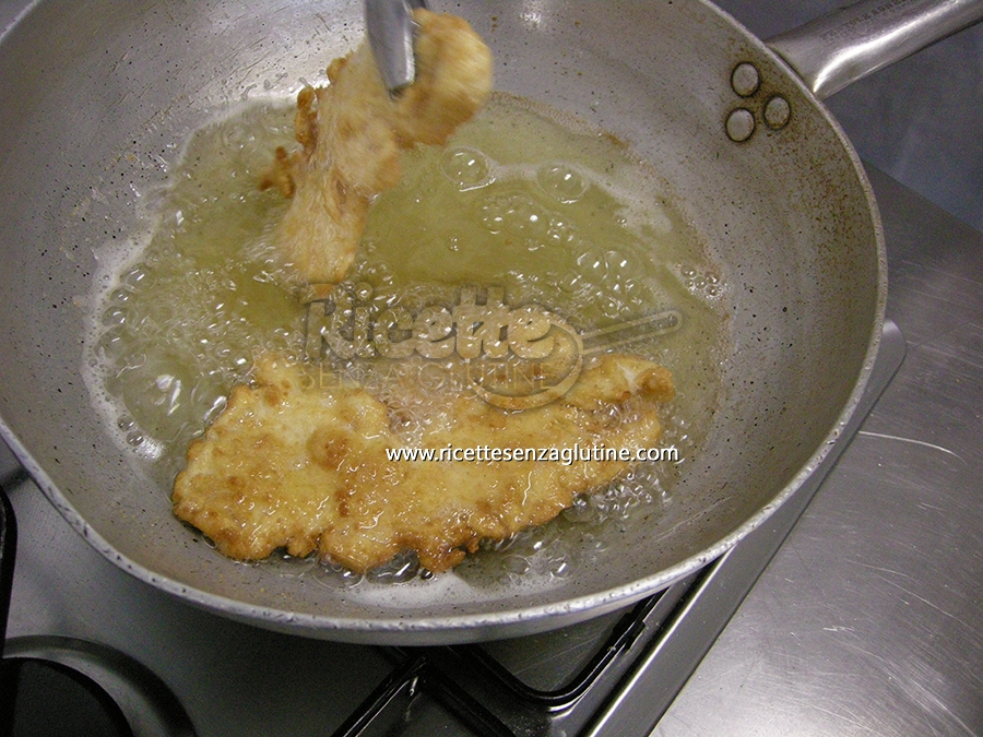 Infarinare le fettine di pollo con la farina di riso; in seguito passarle nelle uova sbattute e infine nel pangrattato senza glutine. |